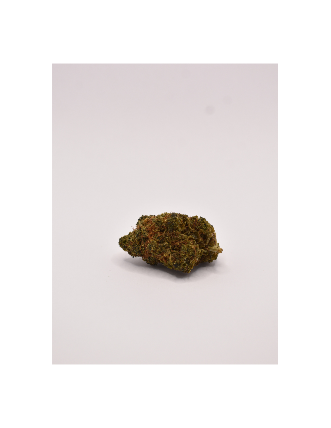 Cette fleur présente des buds de taille moyenne, compacts, d’un vert foncé parsemé de trichomes violets et orangés.
